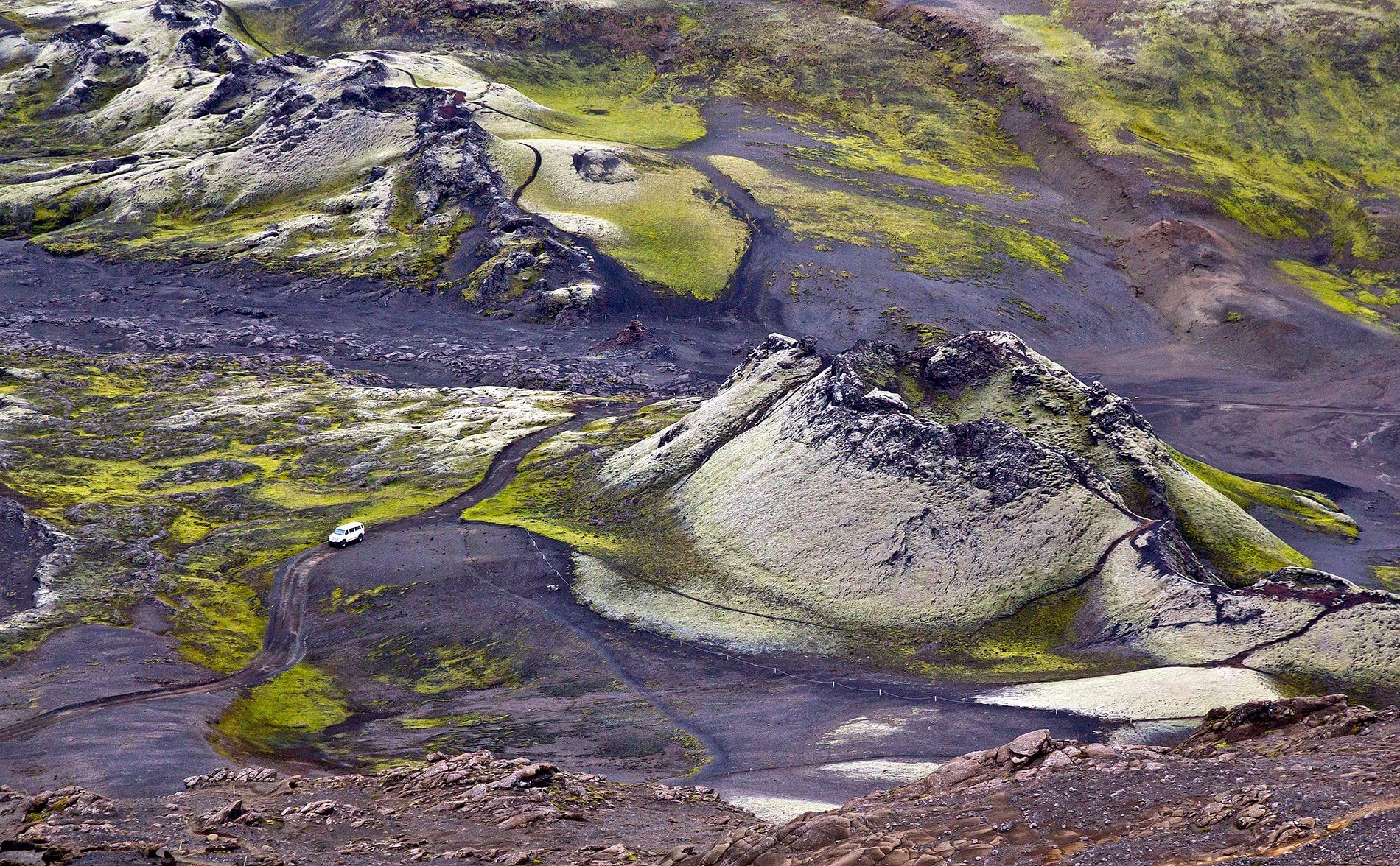 Lakagígar, the Craters of Laki is a 27 kilometres long eruptive fissure consisting of 140 craters. The mountain Laki is standing in the middle of the row and from the top of the mountain is amazing view. The craters started to erupt 1783 resulting in the largest lava flow in the recorded history.